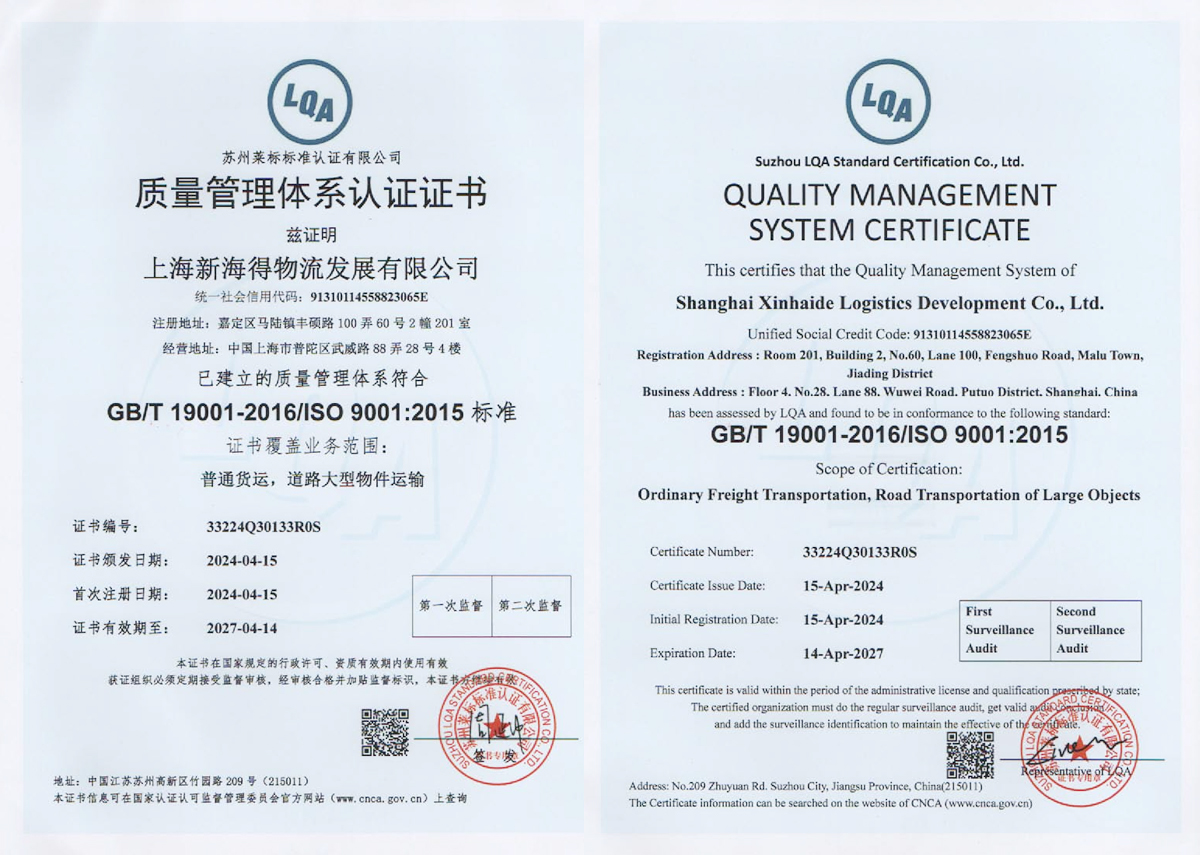 新海得物流嚴(yán)格按現(xiàn)代物流操作流程進(jìn)行標(biāo)準(zhǔn)化運(yùn)作。已通過國(guó)際質(zhì)量管理體系ISO9001:2015體系認(rèn)證。運(yùn)用健全的客戶服務(wù)管理系統(tǒng)、車輛管理系統(tǒng),財(cái)務(wù)管理系統(tǒng)。在查詢、監(jiān)控、追蹤、結(jié)算等方面與客戶做到無縫對(duì)接,打造了專業(yè)高效的客戶服務(wù)體系。